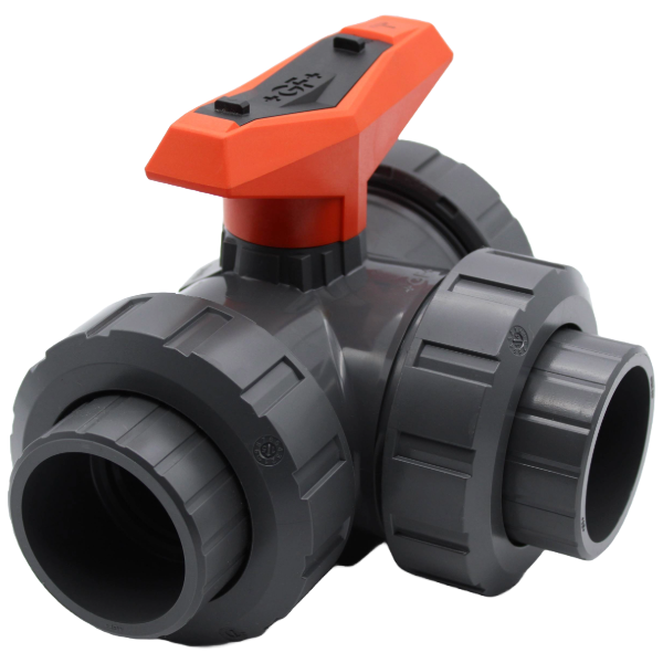Alavanca bloqueável padrão (DN10–DN50) com instalação e remoção facilitadas, compatível com as válvulas Type 546 e 543 (1ª geração). Possui assentos de esfera em PTFE, operação de 360° sem limitador e anel de limitação de 90° ajustável. Conta com inserções de montagem em aço inoxidável integradas e é fornecida no estado A-B-C aberto, conforme o esquema de fluxo.