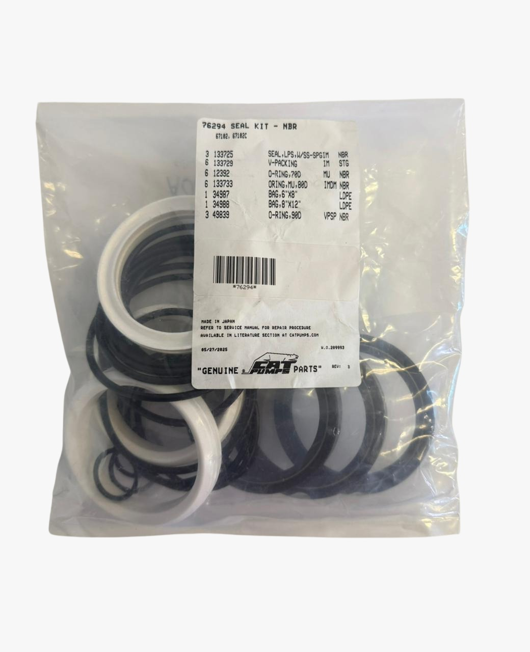 Kit de reparo de vedação CAT Pumps 76294, destinado à bomba 67102, com peças originais para substituição completa das vedações, garantindo desempenho e confiabilidade.