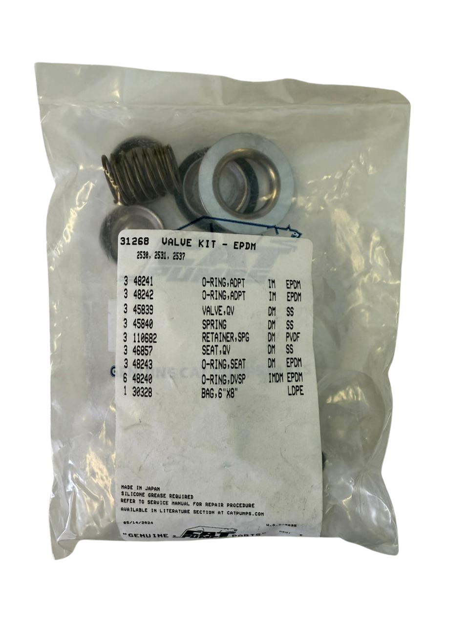 Kit de válvulas CAT Pumps 2531 - ref 30952, projetado para reparo completo do sistema de válvulas. Produto original de alta qualidade, garantindo desempenho e durabilidade equivalentes aos componentes de fábrica. Compatível com diversos modelos de bombas CAT Pumps. Envio rápido e garantia de qualidade.