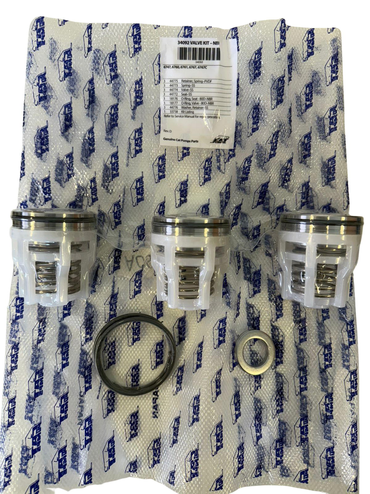 Kit de válvulas CAT Pumps 6761 - ref 34092, projetado para reparo completo do sistema de válvulas. Produto original de alta qualidade, garantindo desempenho e durabilidade equivalentes aos componentes de fábrica. Compatível com diversos modelos de bombas CAT Pumps. Envio rápido e garantia de qualidade.